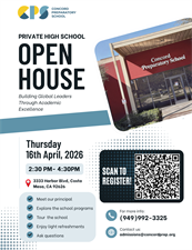 Join us for an Open House at Concord Preparatory School, a private college-preparatory high school located on the border of Costa Mesa and Newport Beach.
